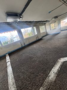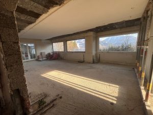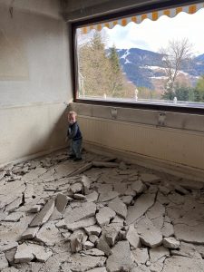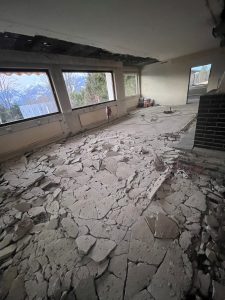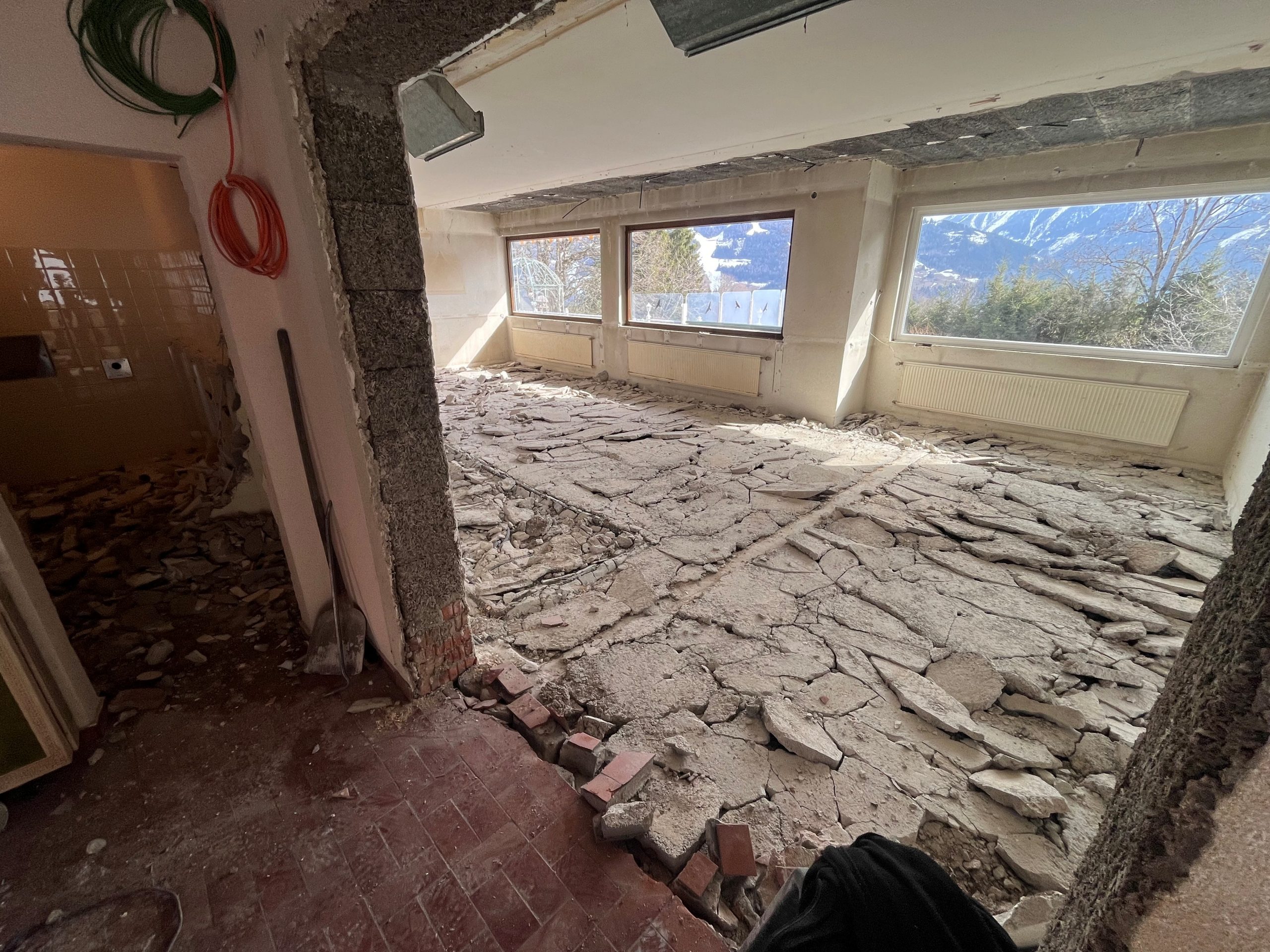 Blick in den Gastraum mit zertrümmerten Estrich.