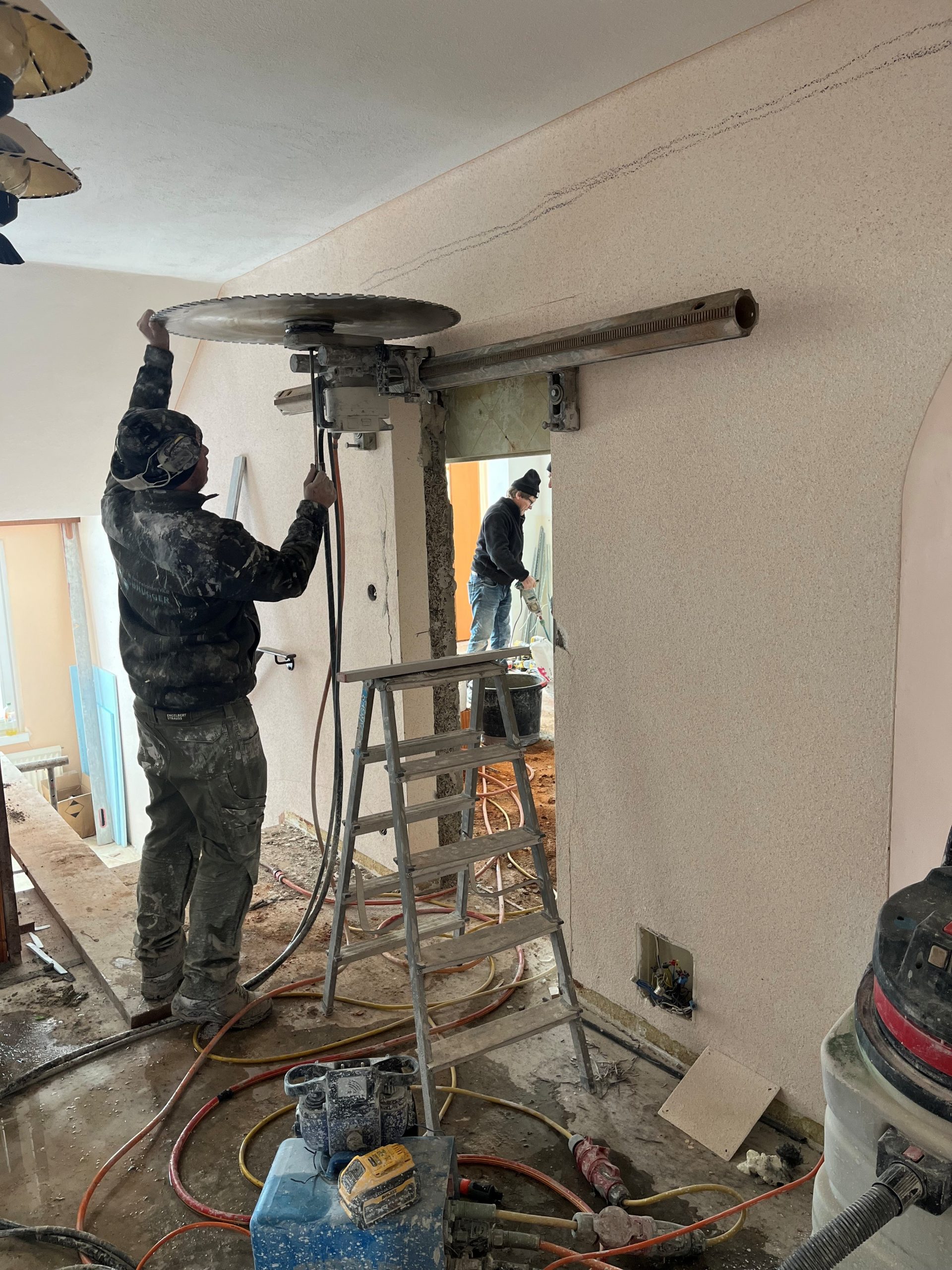 Das Mauerwerk für die neuen Zimmertüren wird zurechtgeschnitten.