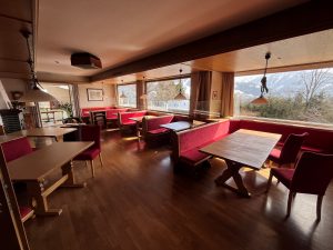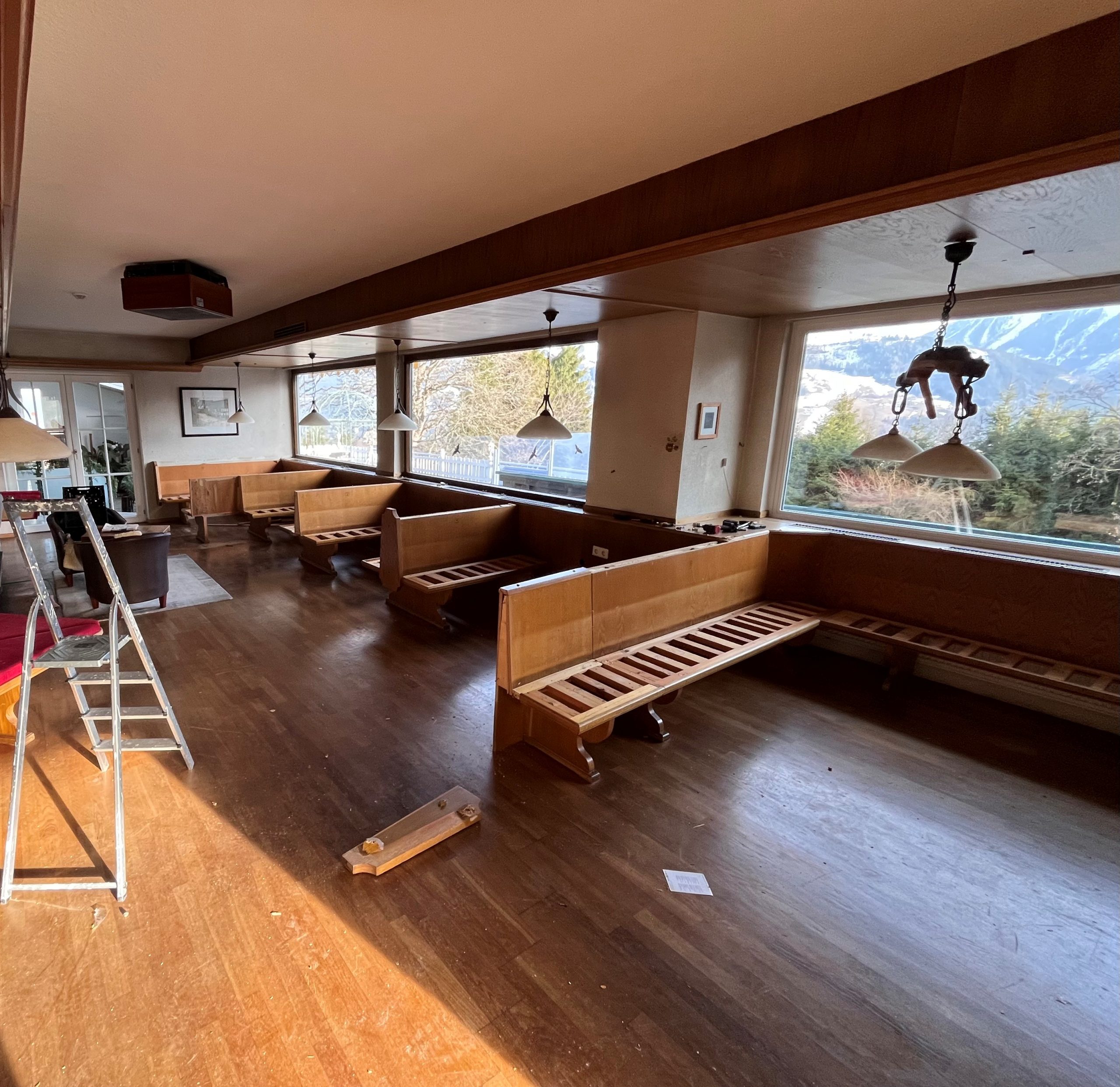 Abendsonne scheint in den komplett freigelegten Gastraum.