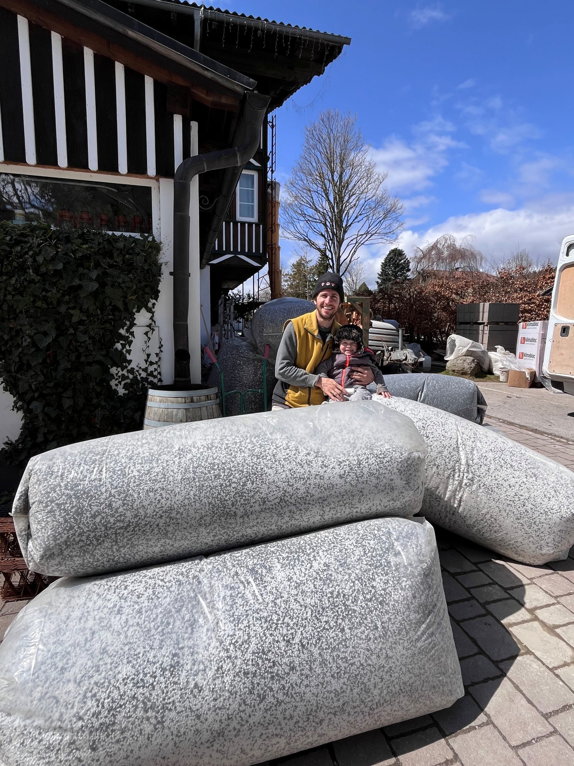 Vater und Sohn interessieren sich für das Bodenschüttmaterial.