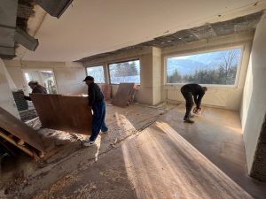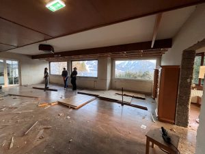 Der alte Holzboden wird mit der Motorsäge zerkleinert und weggetragen.